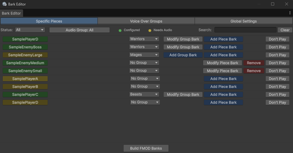The main editor displays every character with visual status indicators. Green means bark audio is configured. Yellow flags characters needing attention. Filter by status, audio group, or search by name to quickly find what you need.