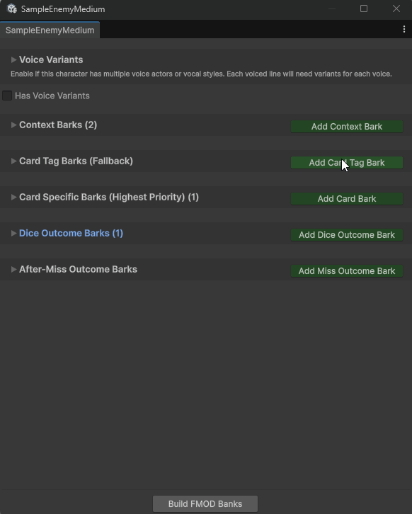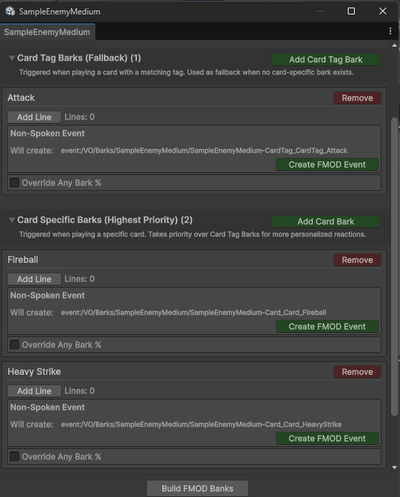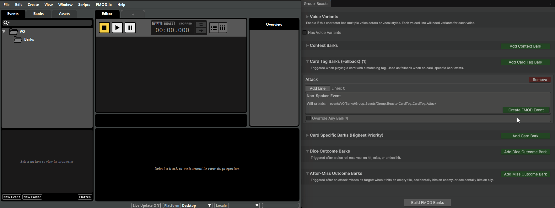 Managing character voice lines is tedious. Audio designers create events in FMOD, programmers wire them up, and changes require back-and-forth between disciplines. Tracking which characters have coverage means digging through folders. Tuning playback probability means asking a programmer to change a number.