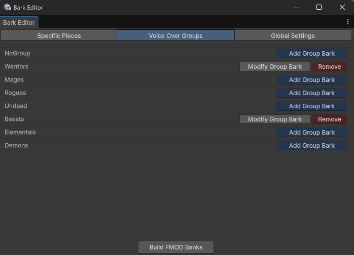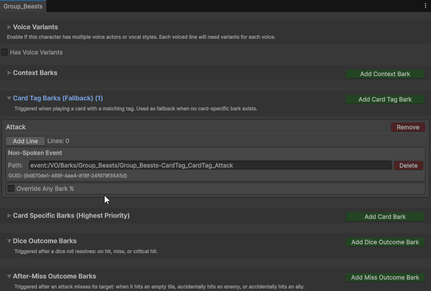 Not every character needs unique voice lines. Voice Over Groups let designers assign characters to shared bark definitions. All characters in a group use the same fallback barks, reducing redundant work for background characters or enemy types.